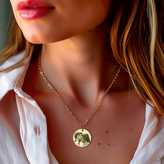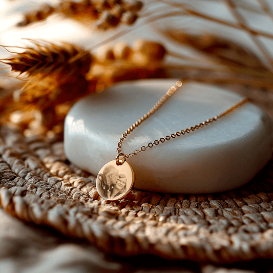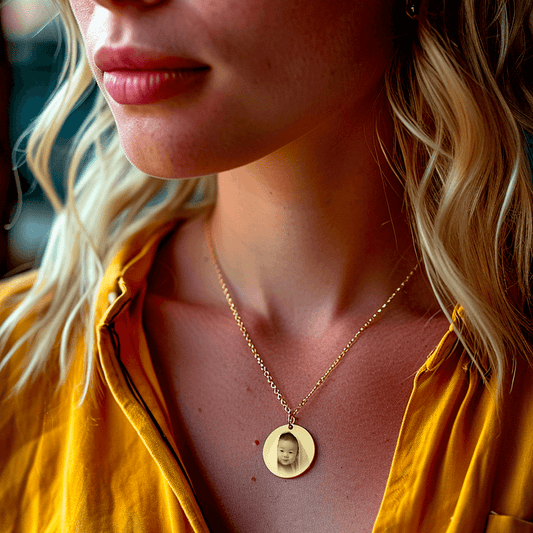 Silver necklace featuring a gravure photo of a smiling baby, set against a natural backdrop.